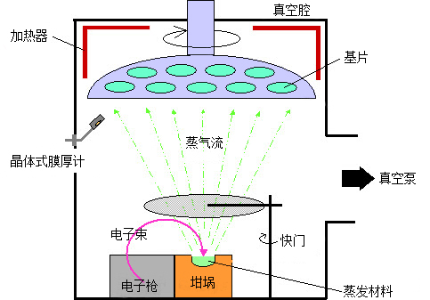 電子束蒸發(fā)的主要原理:高真空環(huán)境下,通過電子槍發(fā)出的高能電子,在電場和磁場作用下,電子轟擊ITO靶材表面使動能轉化為熱能,靶材升溫,變成熔融狀態(tài)或者直接蒸發(fā)出去,在襯底表面沉積成ITO薄膜。