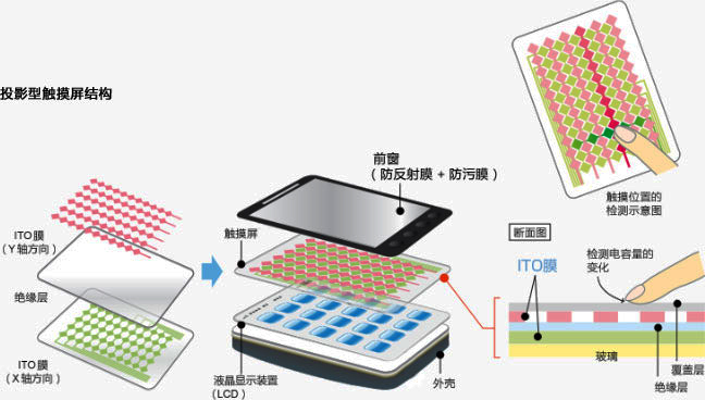 有IPHONE引領的投射電容觸摸屏采用多層ITO層,形成矩陣式分布,以X軸、Y軸交叉分布做為電容矩陣,當手指觸碰屏幕時,可通過X、Y軸的掃描,檢測到觸碰位置電容的變化,進而計算出手指之所在。基于此種架構,投射電容可以做到多點觸控操作。
