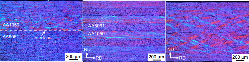 而su[2]等學(xué)者研究發(fā)現(xiàn)退火處理后的AA1050/AA6061板材經(jīng)過累積軋制的超細晶多層復(fù)合材料在不同道次下界面會呈現(xiàn)不同特征,初始三個道次內(nèi),不同鋁合金母材基本上能夠同步協(xié)調(diào)變形,但是當(dāng)軋制次數(shù)變多時,AA6061界面就會發(fā)生頸縮,斷裂,最終發(fā)生界面紊亂。