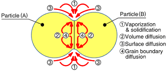 圖a顯示了由于等離子體中的火花引起的頸部形成的初始階段的行為。熱量立即從火花放電柱的中心傳遞到球體表面并擴散,使得晶間結合部分快速冷卻。如圖b所示,其顯示了幾個頸部,脈沖在顆粒之間一個接一個地引起火花放電。即使單個顆粒,隨著重復放電,在相鄰顆粒之間形成頸部的位置的數(shù)量也增加。圖c顯示了SPS燒結晶界的狀態(tài),該燒結晶界在燒結進一步發(fā)展后發(fā)生塑性變形。