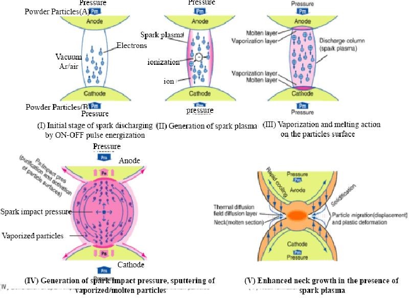 最初由InoueSPS工藝等人研究認為,脈沖電流在顆粒觸點之間產(chǎn)生高溫火花甚至等離子體,這也是該工藝被命名的原因。而Inoue等在之后的研究中認為由于火花放電引起的粒子接觸電離產(chǎn)生了脈沖壓力,促進了原子在接觸處的擴散。Groza等研究提出脈沖電流在顆粒表面上具有清潔效果,而顆粒之間沒有形成氧化。